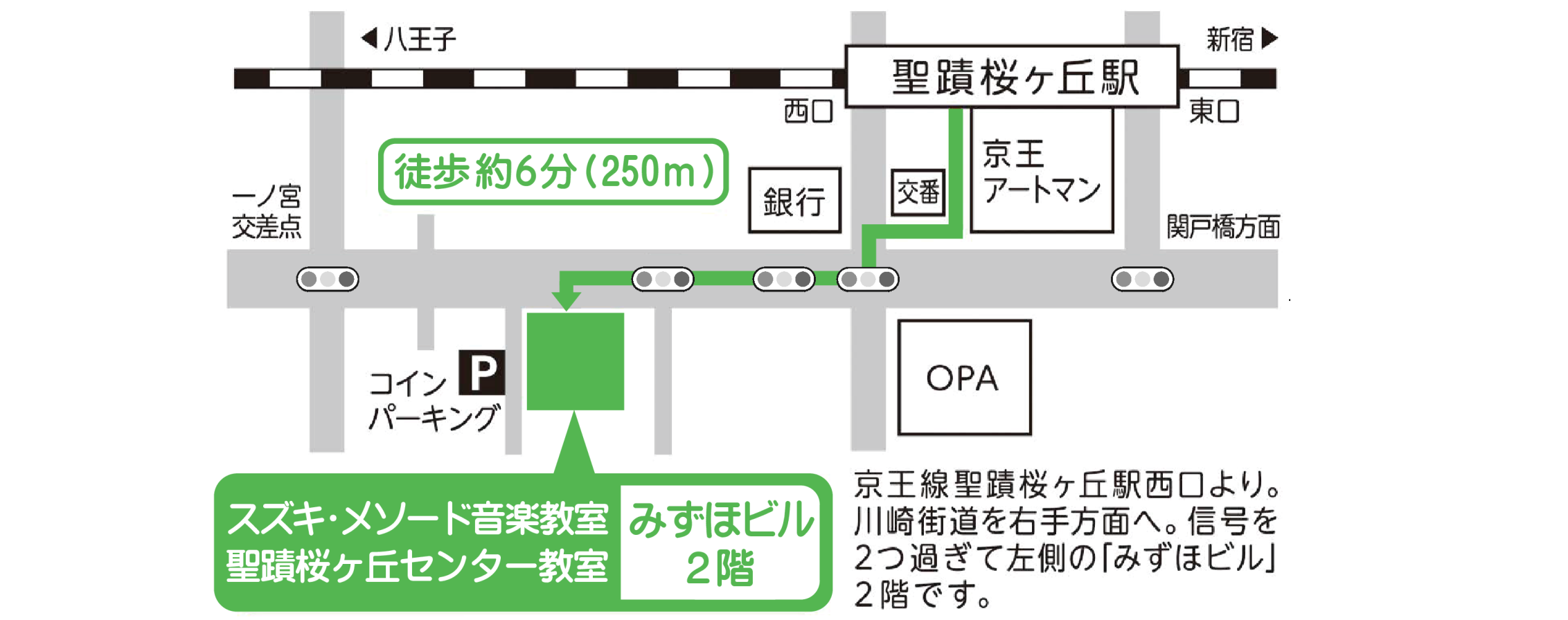 聖蹟桜ヶ丘センター教室(東京都多摩市)は、京王線 聖蹟桜ヶ丘駅から徒歩6分にあり、スズキ・メソードの全科が揃う充実した教室です。